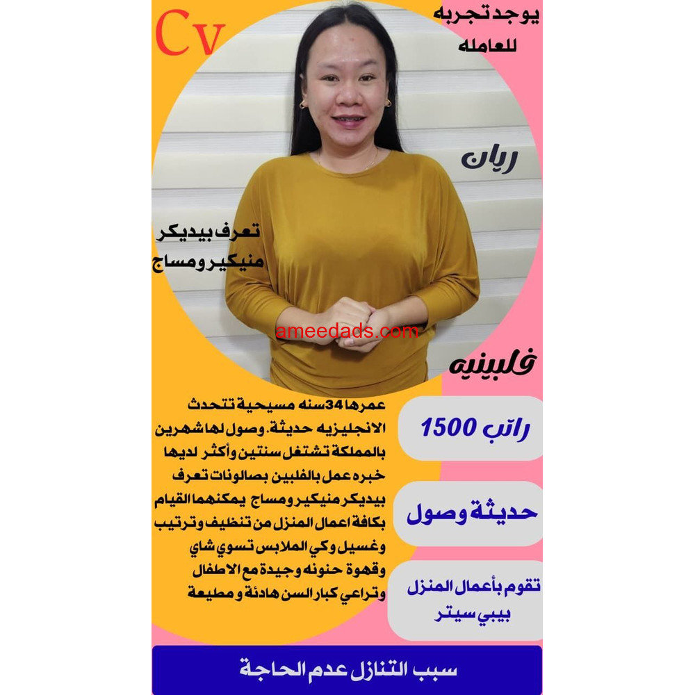 حياكم الله. حابب تتنازل عن خادمتك: مكتب أجياد الهناء في خدمتكم نستقبل عاملات من الفلبين وبنجلاديش كينيا وتعويض خسائر الاستقدام او التنازل نستقبل العماله المنزليه للتنازل بأفضل التعويض نعمل علي مساعدتك في البحث عن رب أسرة جديد للعامله نعمل وفق قوانين مكتب العمل بعقود رسميه نتحمل المصاريف المعيشة خلال فترة تواجدها فى المكتب *كما يوجد عاملات من اوغندا كينيا إثي...